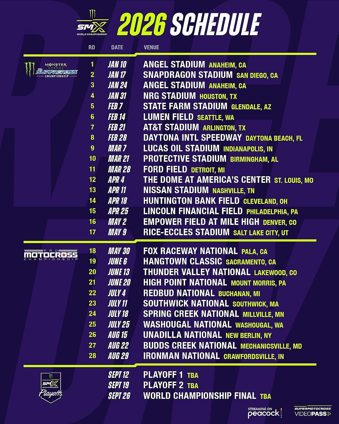 The 2026 season is set to deliver excitement across road racing and off-road action. Fans can follow the complete calendars for MotoGP, WorldSBK, AMA Supercross, AMA Pro Motocross, and the SMX World Championship.