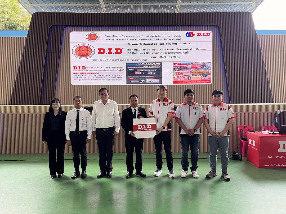 On October 30, 2025, D.I.D Thailand in collaboration with Rayong Technical College organized a hands-on training workshop titled “Motorcycle Chain and Sprocket Drive Systems” for students from the automotive engineering department. The program aimed to strengthen both theoretical understanding and practical skills that can be applied in their studies, internships, and future careers.