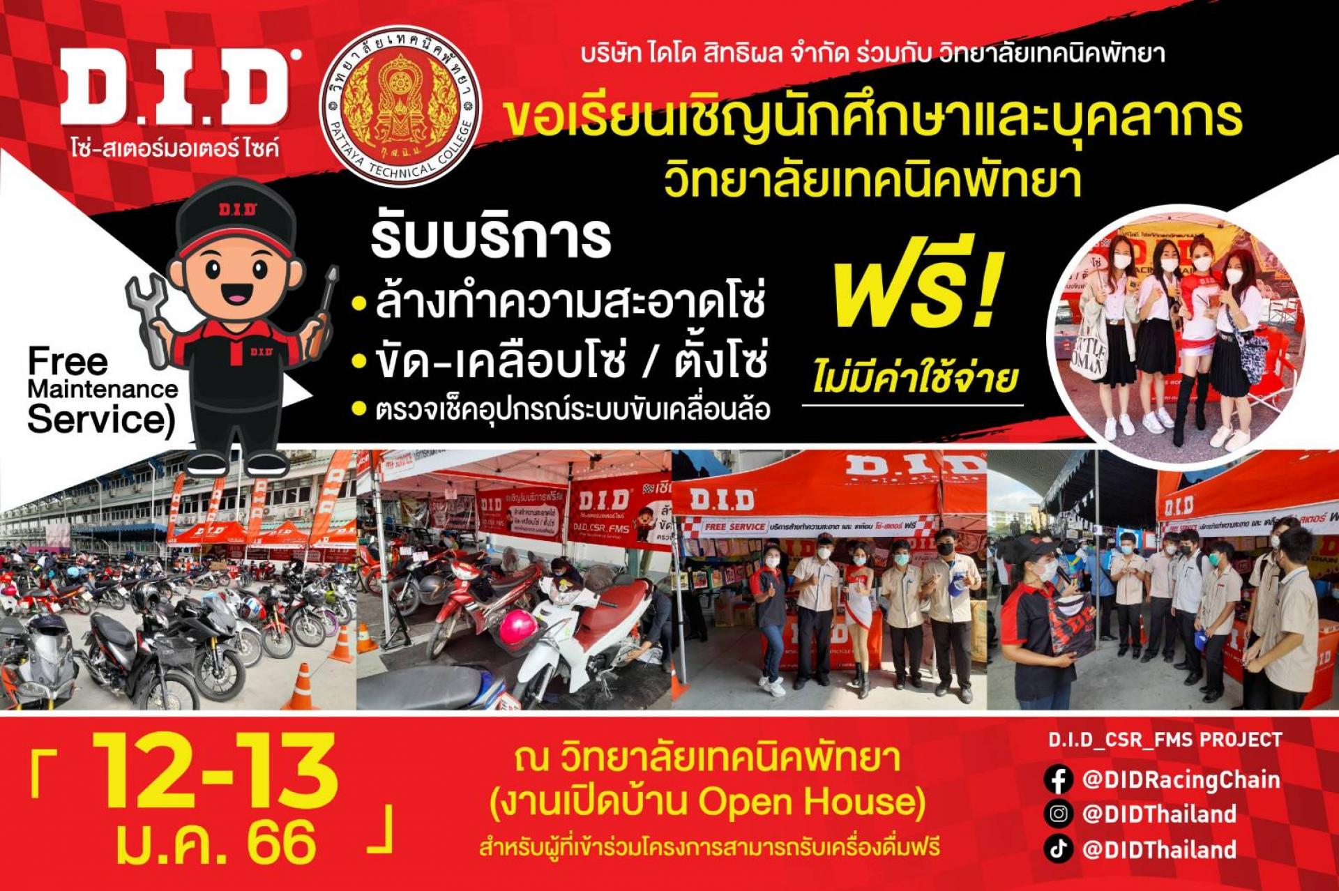 เมื่อวันที่ 10 มกราคม ที่ผ่านมา ทางผู้ผลิตโซ่สเตอร์ดีไอดี (DID) โดยมีคุณณรงค์ ผงคลี รองผู้จัดการทั่วไป ฝ่ายวิศวกรรม, ฝ่ายขายและการตลาด บริษัท ไดโดสิทธิผล จำกัด ร่วมกับวิทยาลัยเทคนิคพัทยา จังหวัดชลบุรี โดยมี ว่าที่พันตรีวานิช สมชาติ ผู้อำนวยการวิทยาลัยเทคนิคพัทยา ให้เกียรติเป็นประธานในพิธีเปิด ให้การอบรมเรื่องโซ่ สเตอร์ ระบบขับเคลื่อนรถมอเตอร์ไซค์แบบเกียร์ และจัดทำกิจกรรมในโครงการ Free Maintenance Service (FMS) ล้างทำความสะอาด เคลือบ และการดูแลรักษาที่ถูกต้อง ให้กับนักเรียน นักศึกษา วิทยาลัยเทคนิคพัทยา จังหวัดชลบุรี โดยช่างผู้ชำนาญงานให้คำปรึกษา และมีการอบรมโดยมีวิทยากร คุณธนศักดิ์ โพธิปักขิย์ เจ้าหน้าที่ฝ่ายขายและการตลาด จากบริษัท ฯ อบรมเกี่ยวกับชิ้นส่วนของโซ่ทั้งภาคทฤษฎีและปฏิบัติ และพร้อมกันนี้ในวันที่ 12 - 13 มกราคม 2566 ทางดีไอดี จะเข้ามาช่วยดูแลน้อง นิสิต นักศึกษา และผู้ที่สนใจ เข้ารับบริการตรวจเช็ค และทำความสะอาดโซ่จักรยานยนต์ฟรี!! จาก D.I.D ตั้งแต่เวลา 8:00-16:00 น. ไม่มีค่าใช้จ่ายแบบนี้ แถมยังได้ดูแลรถที่คุณรัก แล้วพบกัน !!